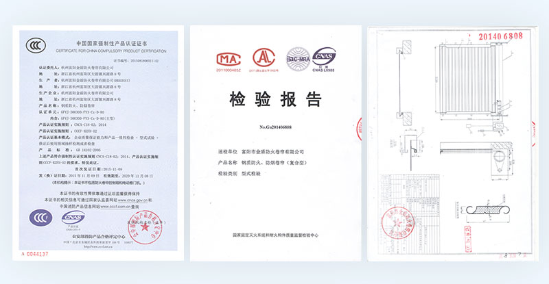 產品按GB14102-2005《防火卷簾》標準檢驗,耐火時間≥3小時,其性能和質量均達到公安部消防產品合格評定中心3C強制認證標準。